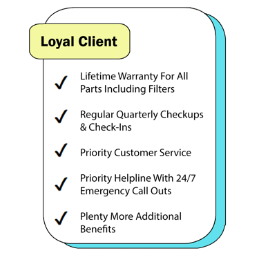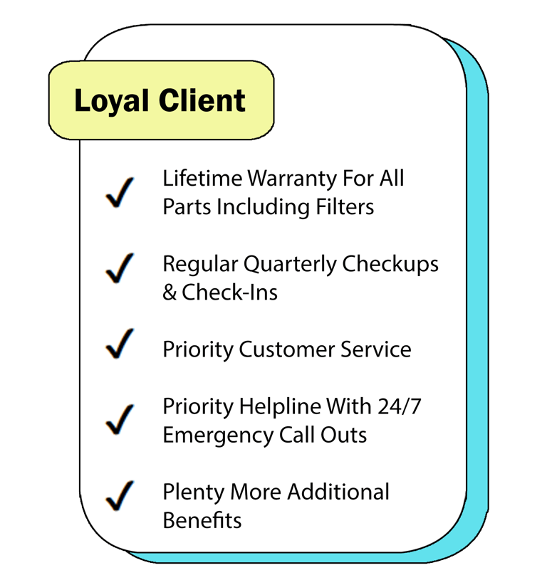 At Aqua Pure Vitality, our Loyal Client Program sets us apart by offering comprehensive maintenance services from the initial installation through the entire lifespan of your filtration system. This program ensures peace of mind, knowing your system is expertly maintained and that professional support is just a phone call away.